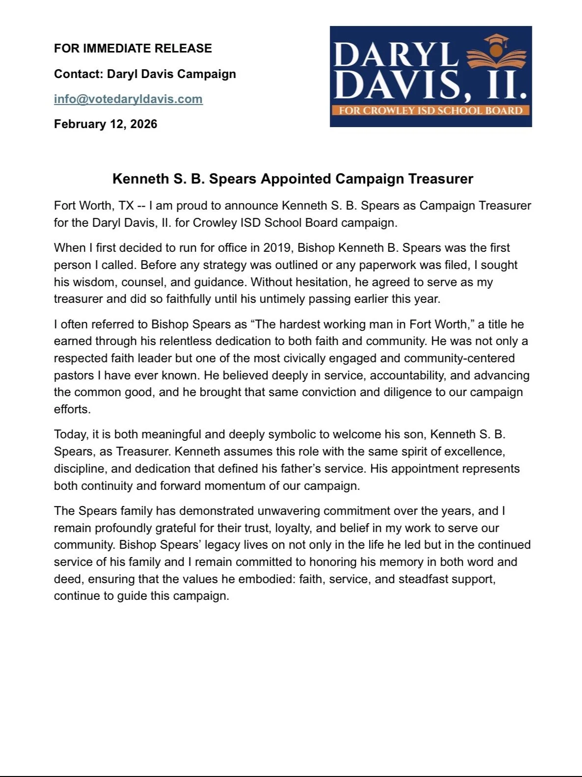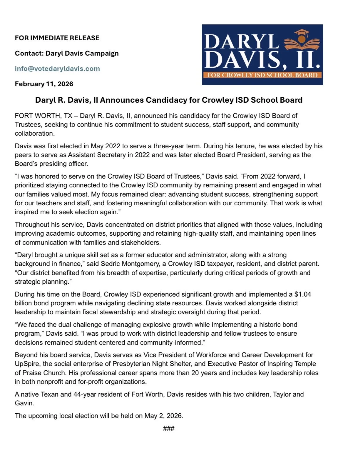 Daryl R. Davis, II. Announces Candidacy for Crowley ISD School Board